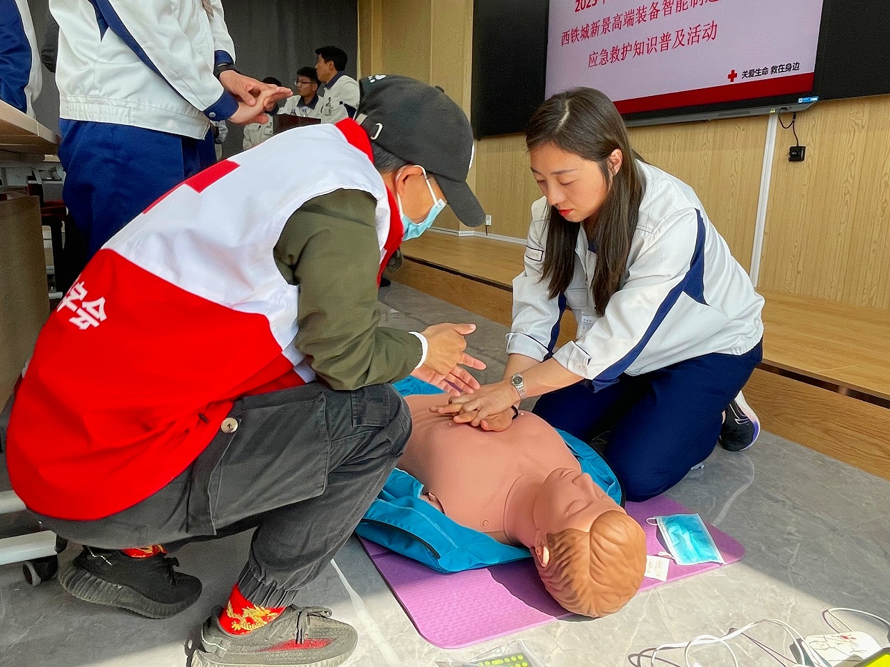 為確保培訓(xùn)效果,受訓(xùn)人員在各位老師的指導(dǎo)下,逐一進(jìn)行仿真模擬練習(xí),現(xiàn)場對心肺復(fù)蘇基本動作要領(lǐng)進(jìn)行實際操作。大家通過直觀感受,切實掌握所學(xué)內(nèi)容。